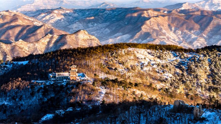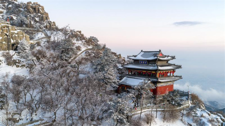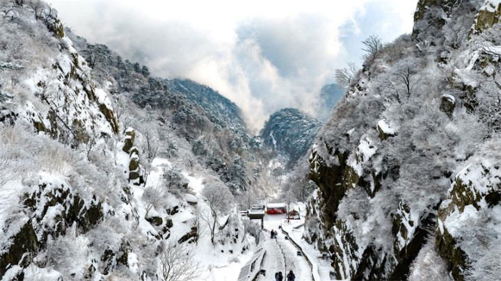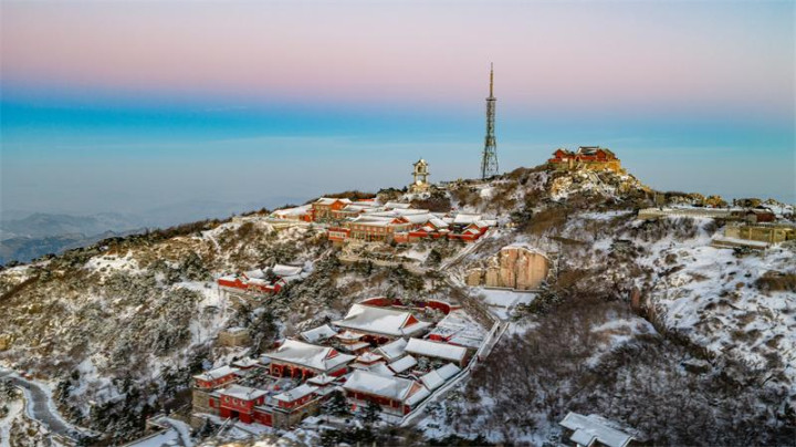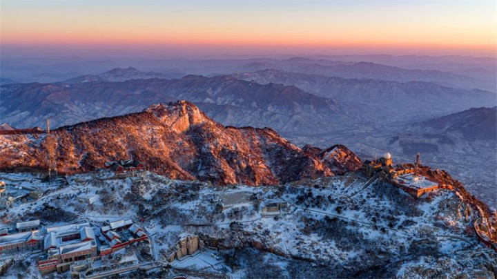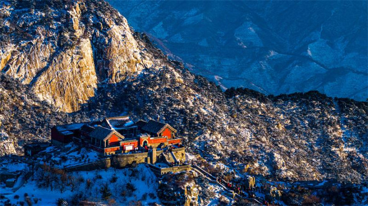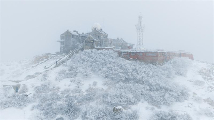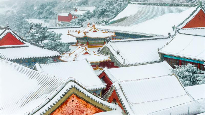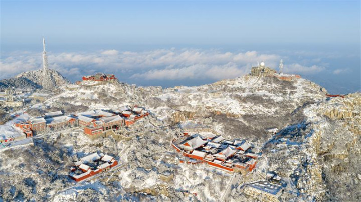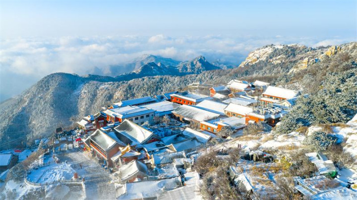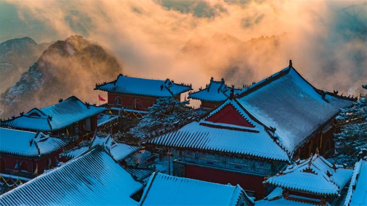 白雪覆盖千峰万壑,峰峦在云雾中若隐若现,宛如水墨长卷徐徐展开。山间古松玉树琼枝,松针托着蓬松积雪随风轻晃;红墙黛瓦的古建筑群被白雪包裹,覆雪的殿宇楼阁飞檐翘角,宛若天宫琼楼玉宇落于人间,朱红宫墙点缀其间,更添几分雅致与庄严。
