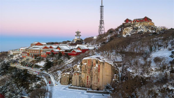 摩崖石刻被白雪勾勒出清晰轮廓,苍劲字迹在素白底色下愈显厚重。十八盘石阶如银丝带蜿蜒向上,连接雪峰。阳光穿透云层洒下,雪面泛着晶莹光泽,尽展泰山冬日的独特神韵。